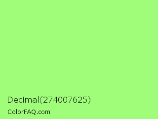 Decimal 274007625 Color is a light green color and the nearest color is Light Green #90ee90. Hex code #a0fd79 and RGB value is rgb(160,253,121). In RGB color space, this color is composed of 63% red, 99% green, 47% blue, In CMYK color space, this color is composed of 37% cyan, 0% magenta, 52% yellow , 1% black , In HSL color space, this color has a hue angle of 102° , 97% saturation and 73% lightness.