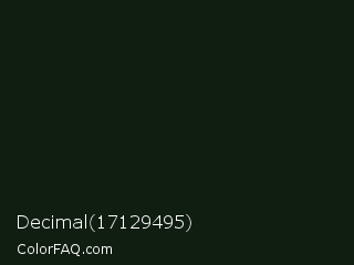Decimal 17129495 Color is a almost black green color and the nearest color is Racing Green #0c1911. Hex code #101d11 and RGB value is rgb(16,29,17). In RGB color space, this color is composed of 6% red, 11% green, 7% blue, In CMYK color space, this color is composed of 45% cyan, 0% magenta, 41% yellow , 89% black , In HSL color space, this color has a hue angle of 125° , 29% saturation and 9% lightness.