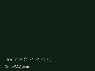 Decimal 17131409 Color is a almost black green color and the nearest color is Aztec #0d1c19. Hex code #102017 and RGB value is rgb(16,32,23). In RGB color space, this color is composed of 6% red, 13% green, 9% blue, In CMYK color space, this color is composed of 50% cyan, 0% magenta, 28% yellow , 87% black , In HSL color space, this color has a hue angle of 146° , 33% saturation and 9% lightness.