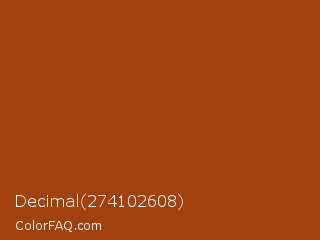 Decimal 274102608 Color is a normal orange color and the nearest color is Oregon #9b4703. Hex code #a1410e and RGB value is rgb(161,65,14). In RGB color space, this color is composed of 63% red, 25% green, 5% blue, In CMYK color space, this color is composed of 0% cyan, 60% magenta, 91% yellow , 37% black , In HSL color space, this color has a hue angle of 21° , 84% saturation and 34% lightness.