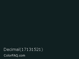 Decimal 17131521 Color is a very dark cyan color and the nearest color is Aztec #0d1c19. Hex code #102021 and RGB value is rgb(16,32,33). In RGB color space, this color is composed of 6% red, 13% green, 13% blue, In CMYK color space, this color is composed of 52% cyan, 3% magenta, 0% yellow , 87% black , In HSL color space, this color has a hue angle of 184° , 35% saturation and 10% lightness.