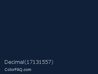 Decimal 17131557 Color is a very dark blue color and the nearest color is Big Stone #162a40. Hex code #102039 and RGB value is rgb(16,32,57). In RGB color space, this color is composed of 6% red, 13% green, 22% blue, In CMYK color space, this color is composed of 72% cyan, 44% magenta, 0% yellow , 78% black , In HSL color space, this color has a hue angle of 217° , 56% saturation and 14% lightness.