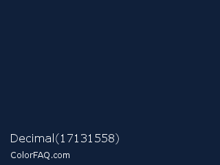 Decimal 17131558 Color is a very dark blue color and the nearest color is Big Stone #162a40. Hex code #10203a and RGB value is rgb(16,32,58). In RGB color space, this color is composed of 6% red, 13% green, 23% blue, In CMYK color space, this color is composed of 72% cyan, 45% magenta, 0% yellow , 77% black , In HSL color space, this color has a hue angle of 217° , 57% saturation and 15% lightness.