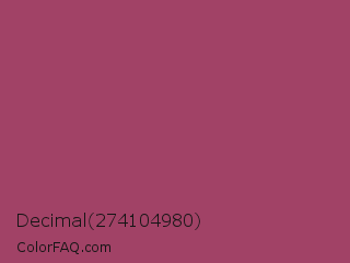 Decimal 274104980 Color is a normal rose color and the nearest color is Rouge #a23b6c. Hex code #a14266 and RGB value is rgb(161,66,102). In RGB color space, this color is composed of 63% red, 26% green, 40% blue, In CMYK color space, this color is composed of 0% cyan, 59% magenta, 37% yellow , 37% black , In HSL color space, this color has a hue angle of 337° , 42% saturation and 45% lightness.