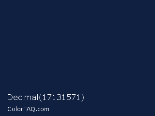 Decimal 17131571 Color is a very dark blue color and the nearest color is Big Stone #162a40. Hex code #102041 and RGB value is rgb(16,32,65). In RGB color space, this color is composed of 6% red, 13% green, 25% blue, In CMYK color space, this color is composed of 75% cyan, 51% magenta, 0% yellow , 75% black , In HSL color space, this color has a hue angle of 220° , 60% saturation and 16% lightness.