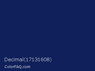 Decimal 17131608 Color is a very dark blue color and the nearest color is Downriver #092256. Hex code #10205a and RGB value is rgb(16,32,90). In RGB color space, this color is composed of 6% red, 13% green, 35% blue, In CMYK color space, this color is composed of 82% cyan, 64% magenta, 0% yellow , 65% black , In HSL color space, this color has a hue angle of 227° , 70% saturation and 21% lightness.