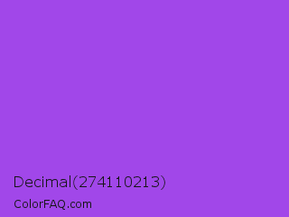 Decimal 274110213 Color is a normal purple color and the nearest color is Navy Purple #9457eb. Hex code #a147e9 and RGB value is rgb(161,71,233). In RGB color space, this color is composed of 63% red, 28% green, 91% blue, In CMYK color space, this color is composed of 31% cyan, 70% magenta, 0% yellow , 9% black , In HSL color space, this color has a hue angle of 273° , 79% saturation and 60% lightness.