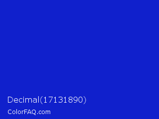 Decimal 17131890 Color is a normal blue color and the nearest color is Persian Blue #1c39bb. Hex code #1020cc and RGB value is rgb(16,32,204). In RGB color space, this color is composed of 6% red, 13% green, 80% blue, In CMYK color space, this color is composed of 92% cyan, 84% magenta, 0% yellow , 20% black , In HSL color space, this color has a hue angle of 235° , 85% saturation and 43% lightness.