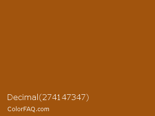 Decimal 274147347 Color is a normal orange color and the nearest color is Rich Gold #a85307. Hex code #a1540d and RGB value is rgb(161,84,13). In RGB color space, this color is composed of 63% red, 33% green, 5% blue, In CMYK color space, this color is composed of 0% cyan, 48% magenta, 92% yellow , 37% black , In HSL color space, this color has a hue angle of 29° , 85% saturation and 34% lightness.