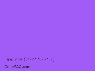 Decimal 274157717 Color is a light violet color and the nearest color is Navy Purple #9457eb. Hex code #a15cf7 and RGB value is rgb(161,92,247). In RGB color space, this color is composed of 63% red, 36% green, 97% blue, In CMYK color space, this color is composed of 35% cyan, 63% magenta, 0% yellow , 3% black , In HSL color space, this color has a hue angle of 267° , 91% saturation and 66% lightness.