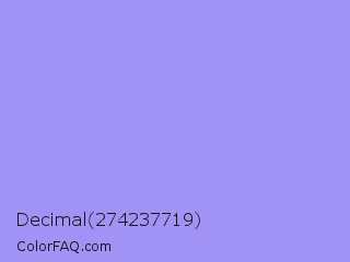 Decimal 274237719 Color is a light indigo color and the nearest color is Dull Lavender #a899e6. Hex code #a192f5 and RGB value is rgb(161,146,245). In RGB color space, this color is composed of 63% red, 57% green, 96% blue, In CMYK color space, this color is composed of 34% cyan, 40% magenta, 0% yellow , 4% black , In HSL color space, this color has a hue angle of 249° , 83% saturation and 77% lightness.