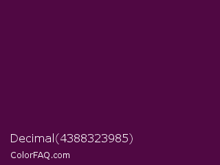Decimal 4388323985 Color is a very dark magenta color and the nearest color is Loulou #460b41. Hex code #500843 and RGB value is rgb(80,8,67). In RGB color space, this color is composed of 31% red, 3% green, 26% blue, In CMYK color space, this color is composed of 0% cyan, 90% magenta, 16% yellow , 69% black , In HSL color space, this color has a hue angle of 311° , 82% saturation and 17% lightness.
