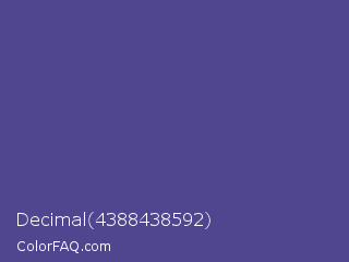 Decimal 4388438592 Color is a normal indigo color and the nearest color is Victoria #534491. Hex code #504690 and RGB value is rgb(80,70,144). In RGB color space, this color is composed of 31% red, 27% green, 56% blue, In CMYK color space, this color is composed of 44% cyan, 51% magenta, 0% yellow , 44% black , In HSL color space, this color has a hue angle of 248° , 35% saturation and 42% lightness.