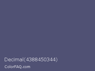 Decimal 4388450344 Color is a normal blue color and the nearest color is Independence #4c516d. Hex code #505174 and RGB value is rgb(80,81,116). In RGB color space, this color is composed of 31% red, 32% green, 45% blue, In CMYK color space, this color is composed of 31% cyan, 30% magenta, 0% yellow , 55% black , In HSL color space, this color has a hue angle of 238° , 18% saturation and 38% lightness.