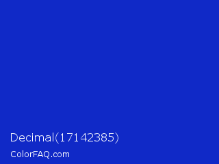 Decimal 17142385 Color is a normal blue color and the nearest color is Persian Blue #1c39bb. Hex code #1029c7 and RGB value is rgb(16,41,199). In RGB color space, this color is composed of 6% red, 16% green, 78% blue, In CMYK color space, this color is composed of 92% cyan, 79% magenta, 0% yellow , 22% black , In HSL color space, this color has a hue angle of 232° , 85% saturation and 42% lightness.
