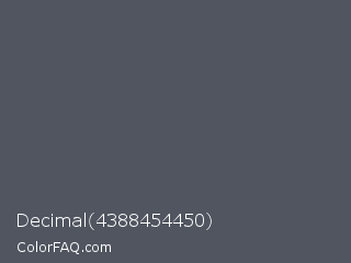 Decimal 4388454450 Color is a normal blue color and the nearest color is Scarpa Flow #585562. Hex code #505560 and RGB value is rgb(80,85,96). In RGB color space, this color is composed of 31% red, 33% green, 38% blue, In CMYK color space, this color is composed of 17% cyan, 11% magenta, 0% yellow , 62% black , In HSL color space, this color has a hue angle of 221° , 9% saturation and 35% lightness.
