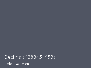 Decimal 4388454453 Color is a normal blue color and the nearest color is Scarpa Flow #585562. Hex code #505563 and RGB value is rgb(80,85,99). In RGB color space, this color is composed of 31% red, 33% green, 39% blue, In CMYK color space, this color is composed of 19% cyan, 14% magenta, 0% yellow , 61% black , In HSL color space, this color has a hue angle of 224° , 11% saturation and 35% lightness.