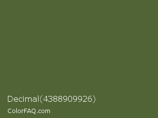 Decimal 4388909926 Color is a dark green color and the nearest color is Dark Olive Green #556b2f. Hex code #516436 and RGB value is rgb(81,100,54). In RGB color space, this color is composed of 32% red, 39% green, 21% blue, In CMYK color space, this color is composed of 19% cyan, 0% magenta, 46% yellow , 61% black , In HSL color space, this color has a hue angle of 85° , 30% saturation and 30% lightness.