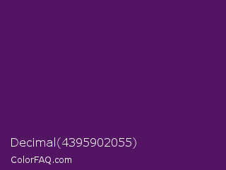 Decimal 4395902055 Color is a dark purple color and the nearest color is Scarlet Gum #431560. Hex code #521463 and RGB value is rgb(82,20,99). In RGB color space, this color is composed of 32% red, 8% green, 39% blue, In CMYK color space, this color is composed of 17% cyan, 80% magenta, 0% yellow , 61% black , In HSL color space, this color has a hue angle of 287° , 66% saturation and 23% lightness.