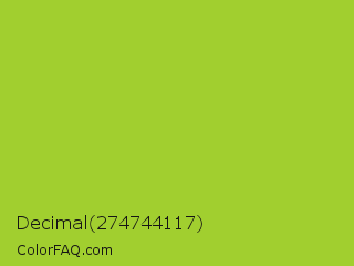 Decimal 274744117 Color is a normal lime color and the nearest color is Yellow Green #9acd32. Hex code #a1cf2f and RGB value is rgb(161,207,47). In RGB color space, this color is composed of 63% red, 81% green, 18% blue, In CMYK color space, this color is composed of 22% cyan, 0% magenta, 77% yellow , 19% black , In HSL color space, this color has a hue angle of 77° , 63% saturation and 50% lightness.
