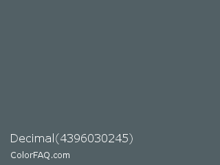 Decimal 4396030245 Color is a normal blue color and the nearest color is Stormcloud #4f666a. Hex code #526065 and RGB value is rgb(82,96,101). In RGB color space, this color is composed of 32% red, 38% green, 40% blue, In CMYK color space, this color is composed of 19% cyan, 5% magenta, 0% yellow , 60% black , In HSL color space, this color has a hue angle of 196° , 10% saturation and 36% lightness.