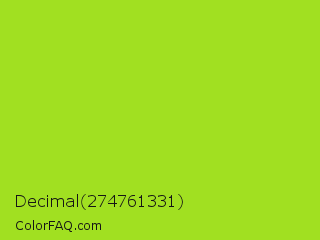Decimal 274761331 Color is a normal green color and the nearest color is Inch Worm #b0e313. Hex code #a1e021 and RGB value is rgb(161,224,33). In RGB color space, this color is composed of 63% red, 88% green, 13% blue, In CMYK color space, this color is composed of 28% cyan, 0% magenta, 85% yellow , 12% black , In HSL color space, this color has a hue angle of 80° , 75% saturation and 50% lightness.