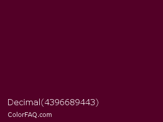 Decimal 4396689443 Color is a very dark rose color and the nearest color is Castro #52001f. Hex code #530027 and RGB value is rgb(83,0,39). In RGB color space, this color is composed of 33% red, 0% green, 15% blue, In CMYK color space, this color is composed of 0% cyan, 100% magenta, 53% yellow , 67% black , In HSL color space, this color has a hue angle of 332° , 100% saturation and 16% lightness.