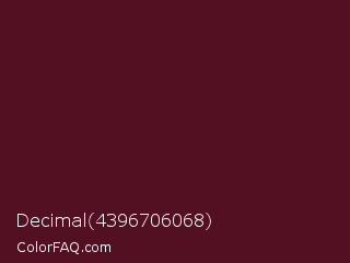 Decimal 4396706068 Color is a very dark rose color and the nearest color is Maroon Oak #520c17. Hex code #531022 and RGB value is rgb(83,16,34). In RGB color space, this color is composed of 33% red, 6% green, 13% blue, In CMYK color space, this color is composed of 0% cyan, 81% magenta, 59% yellow , 67% black , In HSL color space, this color has a hue angle of 344° , 68% saturation and 19% lightness.