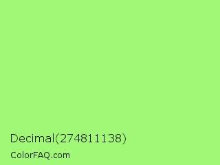 Decimal 274811138 Color is a light green color and the nearest color is Inchworm #b2ec5d. Hex code #a1f876 and RGB value is rgb(161,248,118). In RGB color space, this color is composed of 63% red, 97% green, 46% blue, In CMYK color space, this color is composed of 35% cyan, 0% magenta, 52% yellow , 3% black , In HSL color space, this color has a hue angle of 100° , 90% saturation and 72% lightness.
