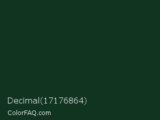 Decimal 17176864 Color is a very dark green color and the nearest color is Phthalo Green #123524. Hex code #103420 and RGB value is rgb(16,52,32). In RGB color space, this color is composed of 6% red, 20% green, 13% blue, In CMYK color space, this color is composed of 69% cyan, 0% magenta, 38% yellow , 80% black , In HSL color space, this color has a hue angle of 147° , 53% saturation and 13% lightness.