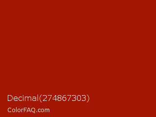 Decimal 274867303 Color is a normal red color and the nearest color is Rufous #a81c07. Hex code #a21603 and RGB value is rgb(162,22,3). In RGB color space, this color is composed of 64% red, 9% green, 1% blue, In CMYK color space, this color is composed of 0% cyan, 86% magenta, 98% yellow , 36% black , In HSL color space, this color has a hue angle of 7° , 96% saturation and 32% lightness.