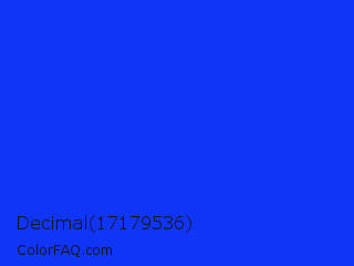 Decimal 17179536 Color is a normal blue color and the nearest color is Blue RYB #0247fe. Hex code #1035f6 and RGB value is rgb(16,53,246). In RGB color space, this color is composed of 6% red, 21% green, 96% blue, In CMYK color space, this color is composed of 93% cyan, 78% magenta, 0% yellow , 4% black , In HSL color space, this color has a hue angle of 230° , 93% saturation and 51% lightness.