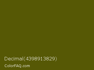 Decimal 4398913829 Color is a very dark yellow color and the nearest color is Saratoga #555b10. Hex code #565805 and RGB value is rgb(86,88,5). In RGB color space, this color is composed of 34% red, 35% green, 2% blue, In CMYK color space, this color is composed of 2% cyan, 0% magenta, 94% yellow , 65% black , In HSL color space, this color has a hue angle of 61° , 89% saturation and 18% lightness.