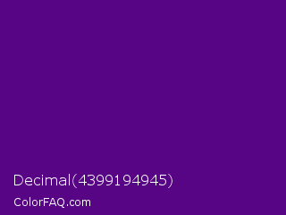 Decimal 4399194945 Color is a dark purple color and the nearest color is Pigment Indigo #4b0082. Hex code #570585 and RGB value is rgb(87,5,133). In RGB color space, this color is composed of 34% red, 2% green, 52% blue, In CMYK color space, this color is composed of 35% cyan, 96% magenta, 0% yellow , 48% black , In HSL color space, this color has a hue angle of 278° , 93% saturation and 27% lightness.