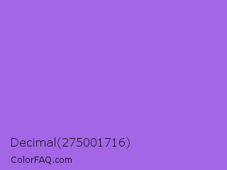 Decimal 275001716 Color is a light violet color and the nearest color is Medium Purple #9370db. Hex code #a266e6 and RGB value is rgb(162,102,230). In RGB color space, this color is composed of 64% red, 40% green, 90% blue, In CMYK color space, this color is composed of 30% cyan, 56% magenta, 0% yellow , 10% black , In HSL color space, this color has a hue angle of 268° , 72% saturation and 65% lightness.