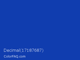 Decimal 17187687 Color is a normal blue color and the nearest color is Egyptian Blue #1034a6. Hex code #103daf and RGB value is rgb(16,61,175). In RGB color space, this color is composed of 6% red, 24% green, 69% blue, In CMYK color space, this color is composed of 91% cyan, 65% magenta, 0% yellow , 31% black , In HSL color space, this color has a hue angle of 223° , 83% saturation and 37% lightness.