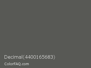 Decimal 4400165683 Color is a normal lime color and the nearest color is Davys Grey #555555. Hex code #585955 and RGB value is rgb(88,89,85). In RGB color space, this color is composed of 35% red, 35% green, 33% blue, In CMYK color space, this color is composed of 1% cyan, 0% magenta, 4% yellow , 65% black , In HSL color space, this color has a hue angle of 75° , 2% saturation and 34% lightness.