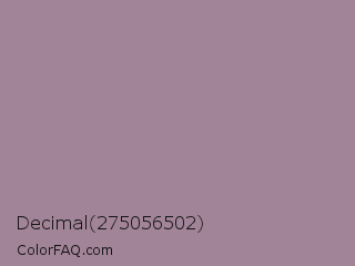 Decimal 275056502 Color is a normal magenta color and the nearest color is Bouquet #ae809e. Hex code #a28498 and RGB value is rgb(162,132,152). In RGB color space, this color is composed of 64% red, 52% green, 60% blue, In CMYK color space, this color is composed of 0% cyan, 19% magenta, 6% yellow , 36% black , In HSL color space, this color has a hue angle of 320° , 14% saturation and 58% lightness.