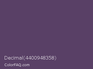 Decimal 4400948358 Color is a normal purple color and the nearest color is English Violet #563c5c. Hex code #594066 and RGB value is rgb(89,64,102). In RGB color space, this color is composed of 35% red, 25% green, 40% blue, In CMYK color space, this color is composed of 13% cyan, 37% magenta, 0% yellow , 60% black , In HSL color space, this color has a hue angle of 279° , 23% saturation and 33% lightness.