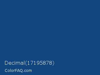 Decimal 17195878 Color is a dark blue color and the nearest color is Dark Cerulean #08457e. Hex code #10457e and RGB value is rgb(16,69,126). In RGB color space, this color is composed of 6% red, 27% green, 49% blue, In CMYK color space, this color is composed of 87% cyan, 45% magenta, 0% yellow , 51% black , In HSL color space, this color has a hue angle of 211° , 77% saturation and 28% lightness.