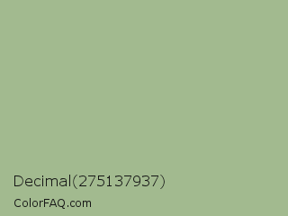 Decimal 275137937 Color is a light green color and the nearest color is Swamp Green #acb78e. Hex code #a2ba8f and RGB value is rgb(162,186,143). In RGB color space, this color is composed of 64% red, 73% green, 56% blue, In CMYK color space, this color is composed of 13% cyan, 0% magenta, 23% yellow , 27% black , In HSL color space, this color has a hue angle of 93° , 24% saturation and 65% lightness.