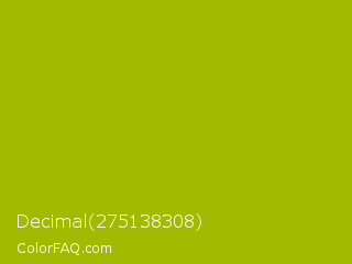 Decimal 275138308 Color is a normal yellow color and the nearest color is Pistachio Green #9dc209. Hex code #a2bb00 and RGB value is rgb(162,187,0). In RGB color space, this color is composed of 64% red, 73% green, 0% blue, In CMYK color space, this color is composed of 13% cyan, 0% magenta, 100% yellow , 27% black , In HSL color space, this color has a hue angle of 68° , 100% saturation and 37% lightness.