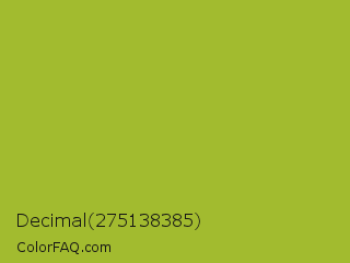 Decimal 275138385 Color is a normal lime color and the nearest color is Android Green #a4c639. Hex code #a2bb2f and RGB value is rgb(162,187,47). In RGB color space, this color is composed of 64% red, 73% green, 18% blue, In CMYK color space, this color is composed of 13% cyan, 0% magenta, 75% yellow , 27% black , In HSL color space, this color has a hue angle of 71° , 60% saturation and 46% lightness.