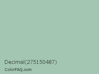 Decimal 275150487 Color is a light green color and the nearest color is Cambridge Blue #a3c1ad. Hex code #a2c6b1 and RGB value is rgb(162,198,177). In RGB color space, this color is composed of 64% red, 78% green, 69% blue, In CMYK color space, this color is composed of 18% cyan, 0% magenta, 11% yellow , 22% black , In HSL color space, this color has a hue angle of 145° , 24% saturation and 71% lightness.
