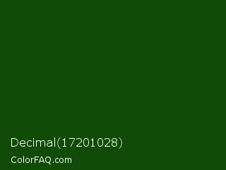 Decimal 17201028 Color is a very dark green color and the nearest color is Dark Fern #0a480d. Hex code #104b08 and RGB value is rgb(16,75,8). In RGB color space, this color is composed of 6% red, 29% green, 3% blue, In CMYK color space, this color is composed of 79% cyan, 0% magenta, 89% yellow , 71% black , In HSL color space, this color has a hue angle of 113° , 81% saturation and 16% lightness.