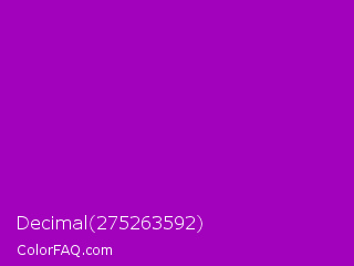 Decimal 275263592 Color is a normal magenta color and the nearest color is Heliotrope Magenta #aa00bb. Hex code #a302bc and RGB value is rgb(163,2,188). In RGB color space, this color is composed of 64% red, 1% green, 74% blue, In CMYK color space, this color is composed of 13% cyan, 99% magenta, 0% yellow , 26% black , In HSL color space, this color has a hue angle of 292° , 98% saturation and 37% lightness.