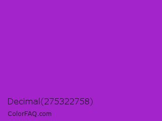 Decimal 275322758 Color is a normal purple color and the nearest color is Dark Orchid #9932cc. Hex code #a324ca and RGB value is rgb(163,36,202). In RGB color space, this color is composed of 64% red, 14% green, 79% blue, In CMYK color space, this color is composed of 19% cyan, 82% magenta, 0% yellow , 21% black , In HSL color space, this color has a hue angle of 286° , 70% saturation and 47% lightness.