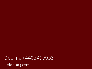 Decimal 4405415953 Color is a very dark red color and the nearest color is Rosewood #65000b. Hex code #600103 and RGB value is rgb(96,1,3). In RGB color space, this color is composed of 38% red, 0% green, 1% blue, In CMYK color space, this color is composed of 0% cyan, 99% magenta, 97% yellow , 62% black , In HSL color space, this color has a hue angle of 359° , 98% saturation and 19% lightness.
