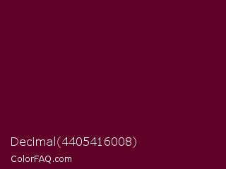 Decimal 4405416008 Color is a very dark rose color and the nearest color is Black Rose #67032d. Hex code #600128 and RGB value is rgb(96,1,40). In RGB color space, this color is composed of 38% red, 0% green, 16% blue, In CMYK color space, this color is composed of 0% cyan, 99% magenta, 58% yellow , 62% black , In HSL color space, this color has a hue angle of 335° , 98% saturation and 19% lightness.