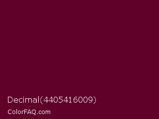 Decimal 4405416009 Color is a very dark rose color and the nearest color is Black Rose #67032d. Hex code #600129 and RGB value is rgb(96,1,41). In RGB color space, this color is composed of 38% red, 0% green, 16% blue, In CMYK color space, this color is composed of 0% cyan, 99% magenta, 57% yellow , 62% black , In HSL color space, this color has a hue angle of 335° , 98% saturation and 19% lightness.